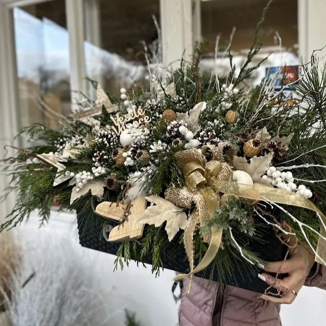 Luxusní vánoční truhlík z čerstvého chvojí laděný do jemných bílých a přírodních tónů. Aranžmá zdobí dřevěná hvězda, zasněžené šišky a drobné bílé bobulky, které dodávají celé dekoraci jemný zimní vzhled a působí jako čerstvě pokryté sněhem. Přírodní prvky krásně doplňují svěží zeleň jehličí, díky čemuž truhlík působí čistě, elegantně a velmi vkusně. Díky délce přibližně 90 cm perfektně vyplní parapet i venkovní okno. Truhlík je připravený k okamžitému umístění – stačí jej položit na vybrané místo a užívat si kouzelnou zimní náladu, kterou vnese do vašeho domova.