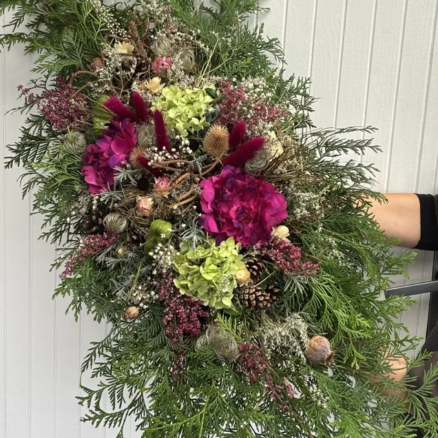 Výpich je ozdoben velkolepou hortenzií, přírodními šiškami, bobulemi a dalšími podzimními dekoracemi, které dohromady vytvářejí elegantní a důstojný vzhled. Spojení čerstvého chvojí a sušených či umělých prvků přináší aranžmá, které působí harmonicky a vydrží déle než klasické květiny.