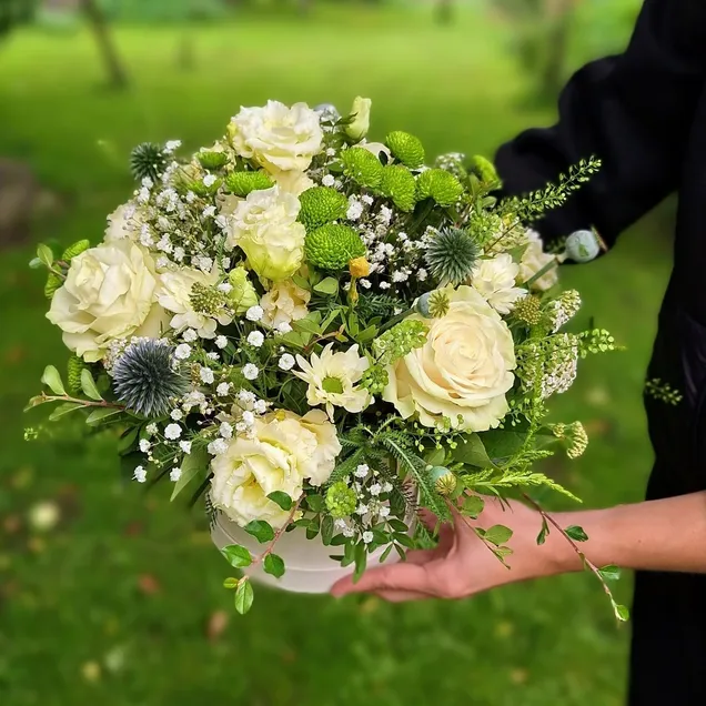 ✂️ Složení flower boxu: 1× dárková krabička + florex 3× bílá růže 2× eustoma 2× santini 1× chryzantéma 1× nevěstin závoj dekorativní zeleň
