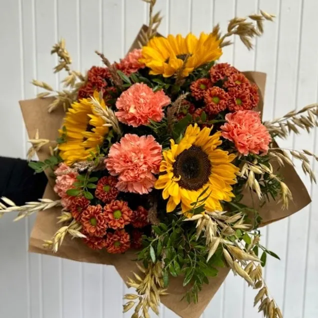 Podzimní kytice plná hřejivých barev 🍂 – zářivé slunečnice, jemné karafiáty, elegantní santini a přírodní klasy tvoří jedinečnou kombinaci, která vnese do každého domova kouzlo podzimu.