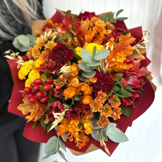 Tato podzimně laděná kytice je nádherným symbolem tepla, vášně a elegance ❤️. Kombinace sytě rudých alstromerií a karafiátů doplněná o santini v podzimních odstínech přináší do interiéru hřejivou atmosféru babího léta 🍁. Dekorační zeleň a klasy dodávají kytici přirozený vzhled, který dokonale vystihuje kouzlo podzimu.