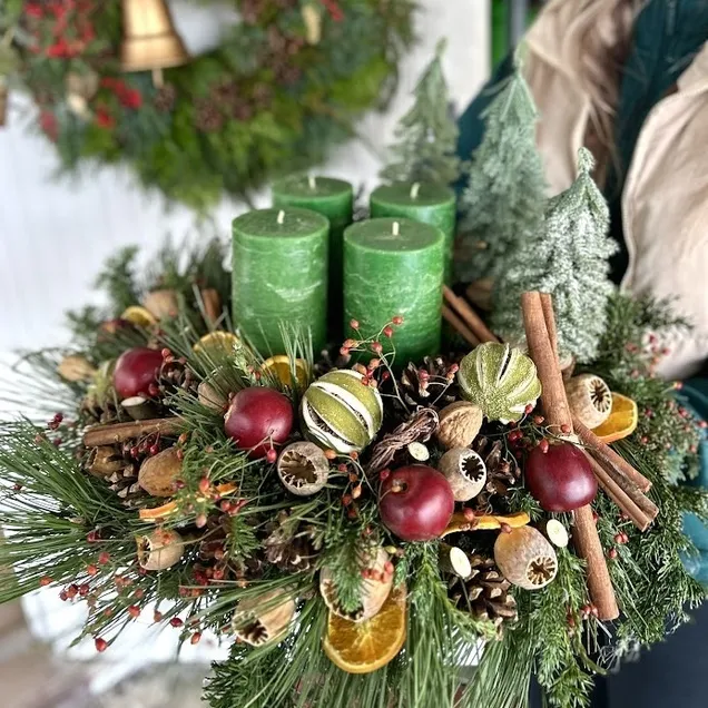 Tento adventní věnec na základu z živých větví vyniká svou přirozeností a rustikálně vánočním vzhledem. Zdobený mixem živého chvojí, přírodninami, šiškami, skořicí a drobnými červenými bobulkami. Dominantní sytě zelené svíčky dodávají celému aranžmá slavnostní nádech a zaručeně rozsvítí každý sváteční stůl.