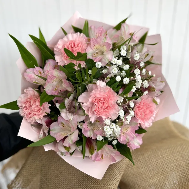 Složení květin: 5x alstromerie růžová, 4x karafiát růžový, 1x nevěstin závoj, doplněno zelení + papír.