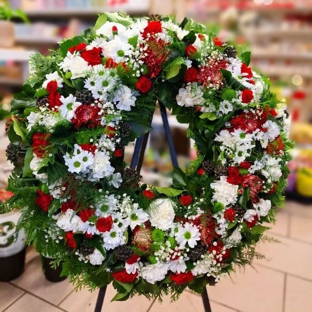 Smuteční věnec před rakev je důstojné aranžmá vhodné k umístění na stojan. Podtrhuje pietu a vážnost posledního rozloučení a díky florexové podložce zůstávají květiny čerstvé a krásné.