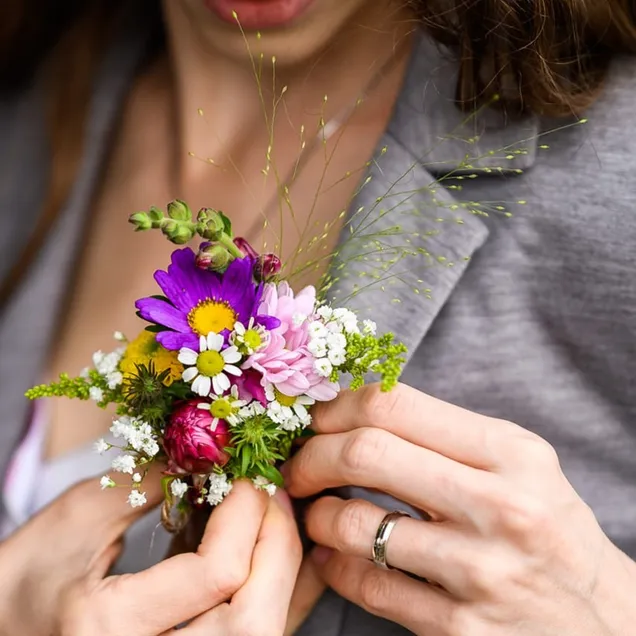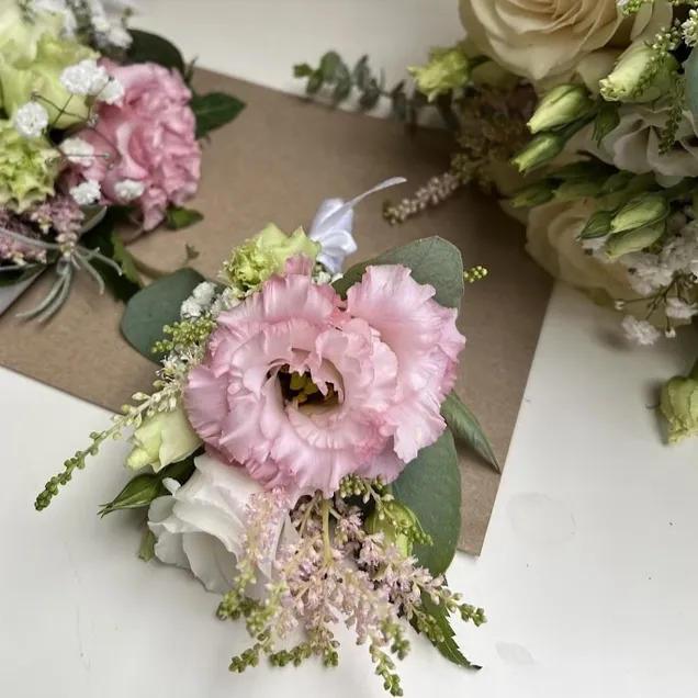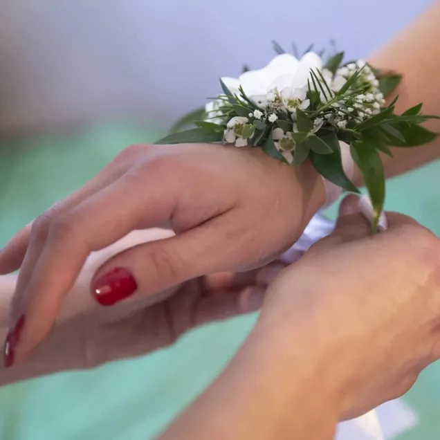 Korsáž je drobný, ale významný detail svatebního dne. 🌿 Pro ženicha se připravuje výraznější korsáž ladící se svatební kyticí nevěsty, zatímco pro svědky a další blízké osoby menší, jednodušší varianty ve stejném stylu. Pro svědkyně či družičky tvoříme květinové náramky, které jsou krásným doplňkem.