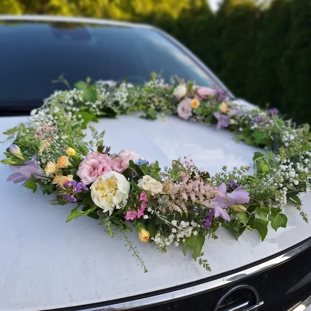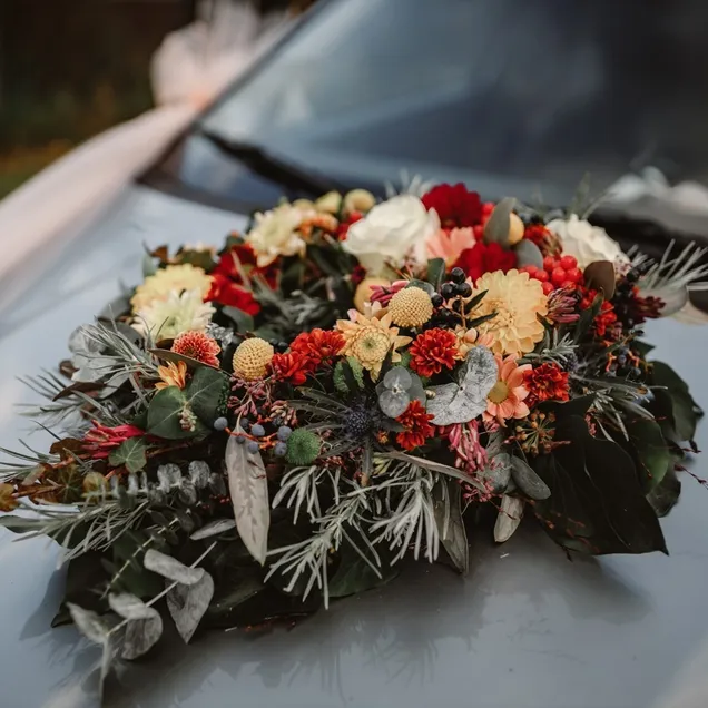 Tvoříme menší ikebany na svatební stoly, výraznější do čela tabule či ikebany pro výzdobu kostela. Nabízíme také výzdobu auta, kde používáme speciální florex pro bezpečné uchycení na povrch vozu. Každá ikebana je navržena na míru tak, aby ladila s celkovým stylem Vaší svatby.
