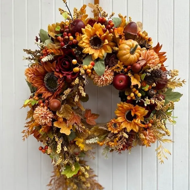 Rozzařte svůj domov s naším bohatým podzimním věncem, který okouzlí na první pohled svou pestrostí a hřejivou barevností. Věnec je zdobený kombinací umělých slunečnic, růží, chryzantém, dekorativních jablíček a dýní, doplněný o bobule, šišky a podzimní listy.
